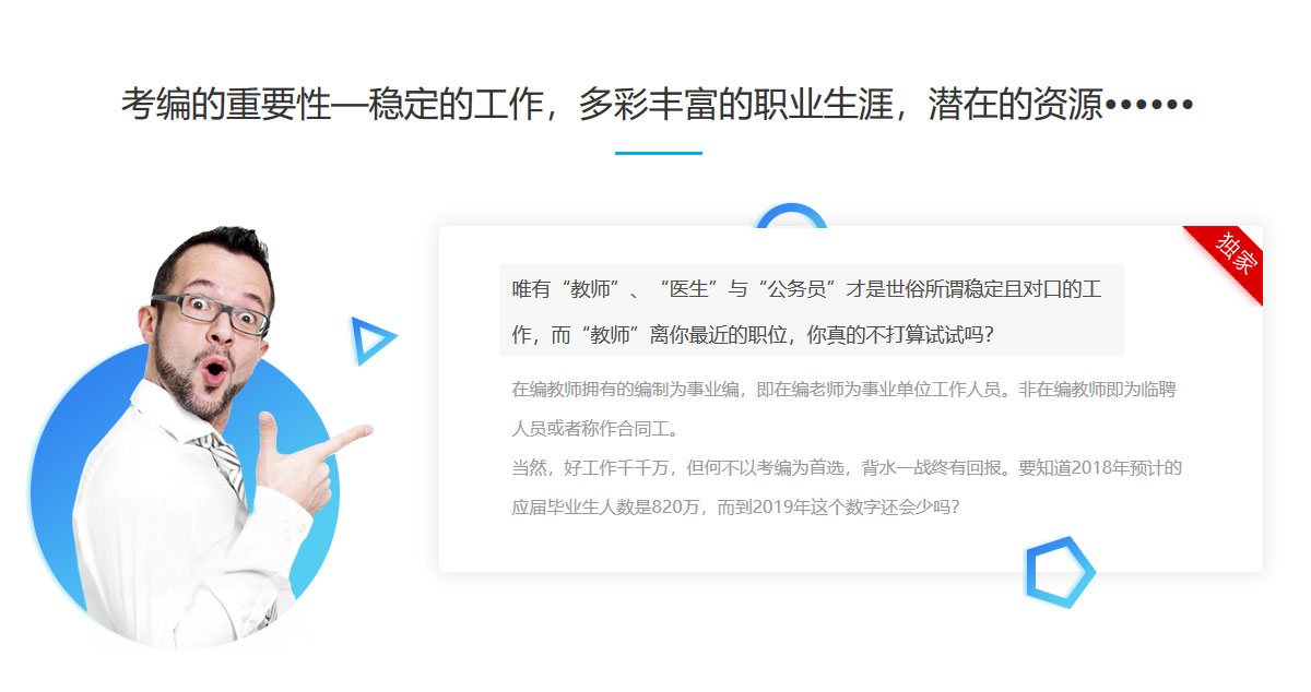 笔试+ 面试 | 5人各专业 | 此类课程招5人(限语、数、英、音、体、美、计算机、学前8个专业)。针对参加2020年教师编制考试的学生。由考务专家测评后量身定制私人课程,随到随学,海量课时,保质保量。 | 电话咨询 |