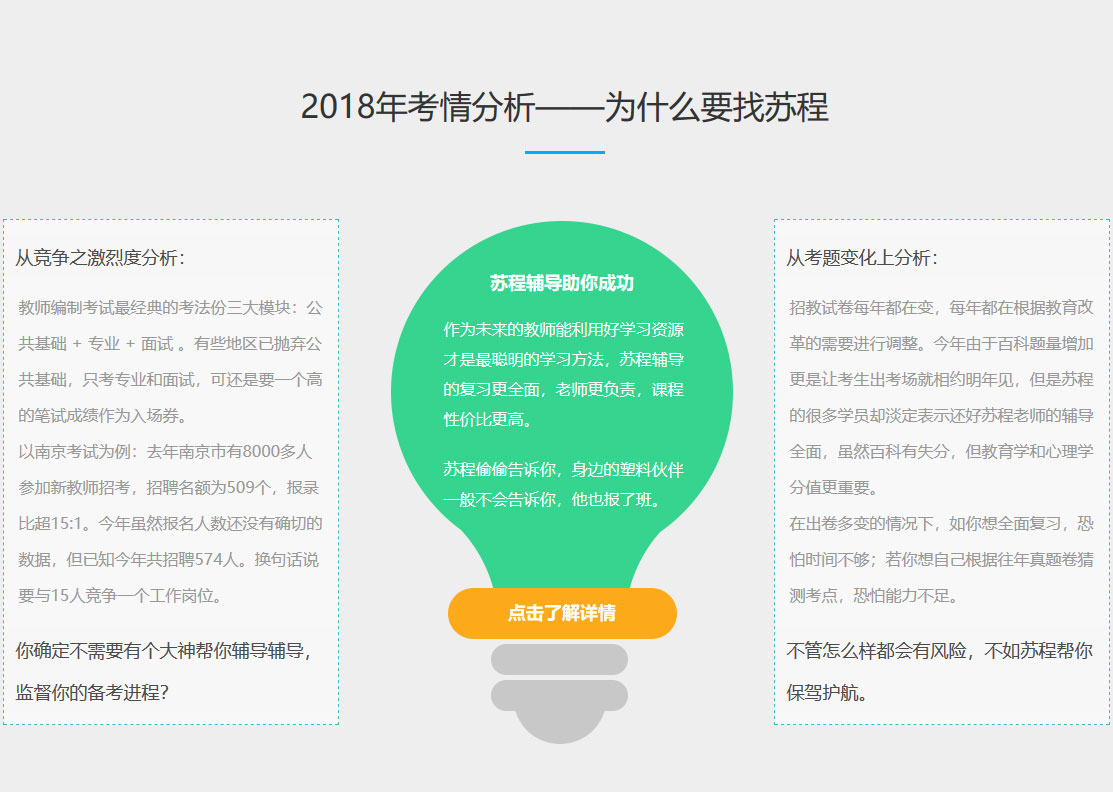 此课程招30人(限中、小学语、数、英、音、体、美、计算机及学前8个专业)。此班对学员有考核标准,通过考核者再进行小班化、个性化教学,笔试、面试全包。 未录用上岗者,全额退款。 此班2018通过率为98%。 |